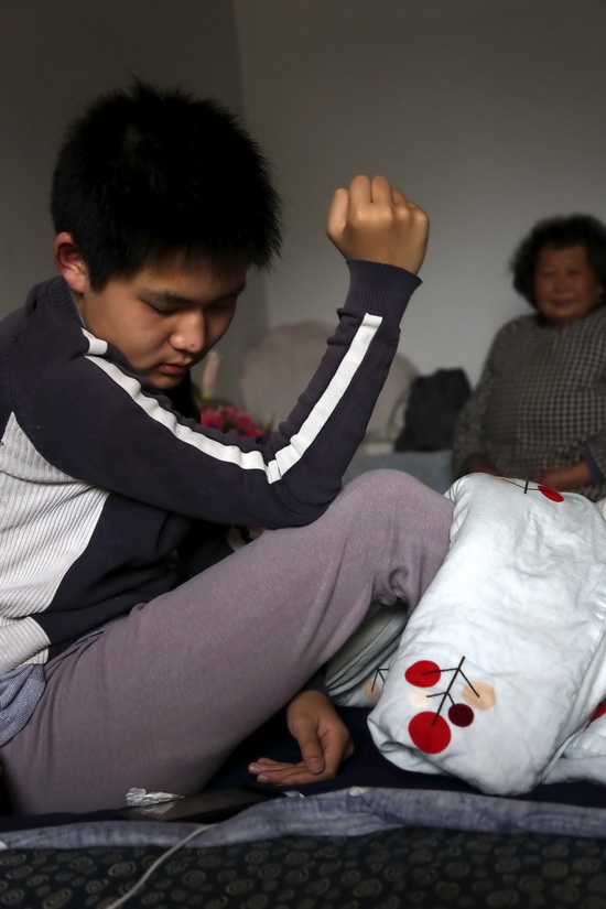 在苏州的临时租住房里,王一竹敲打和搓揉大腿和膝盖以缓解打动员针后的疼痛(2月26日摄)。