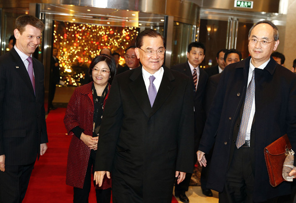 图为连方瑀(中)等人到达连战下榻的金融街威斯汀酒店。