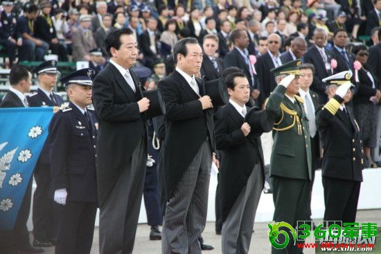2011年10月16日,日本航空自卫队阅兵式在茨城县航空自卫队百里基地举行。图为日本首相野田佳彦(前排左一)出席航空自卫队阅兵式。