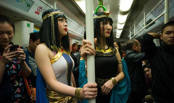 2月24日下午,深圳地铁罗宝线上因为六位“埃及艳后”的搭乘变得热闹起来,市民争相拍照发微博。据了解。“埃及艳后”们是为3月份的古埃及展览做宣传。