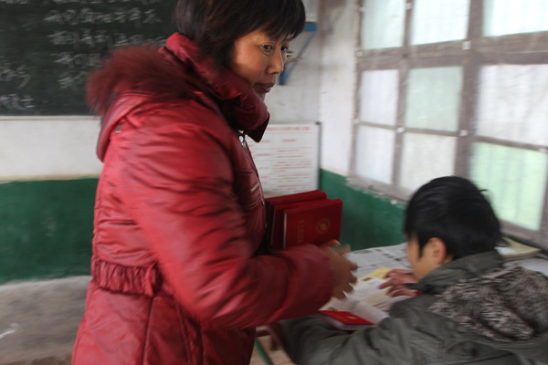 2012年11月27日,一名老师拿来毛主席语录的红册子发给学生们读。