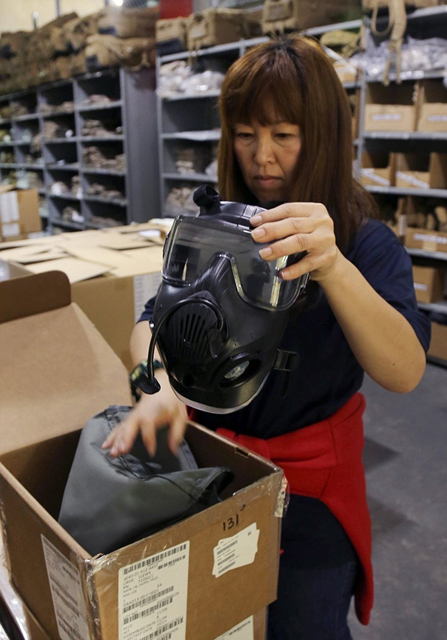 此外,美海军陆战队会对年轻队员实施有关冲绳历史以及日本文化的讲座,同时日本人的生活习惯以及社会礼仪等也是他们每天的必修课。图为美国海军陆战队所使用的防毒面具。
