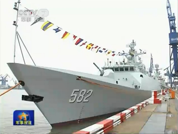 2月25日下午,我国新型护卫舰首舰582号蚌埠舰交舰仪式在上海举行。中央军委委员、海军司令员吴胜利出席交舰仪式并讲话。当天,央视报道了该舰交舰全过程,并拍到了056舰内部及部分舰载武器独家画面。
