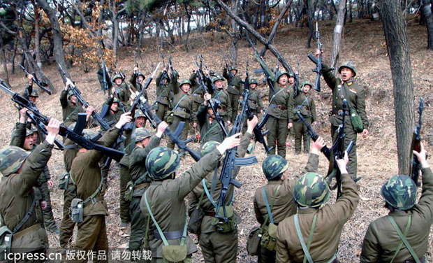 当地时间2013年3月6日,朝鲜平壤,金正日军事大学的士兵举行军演。当天,朝鲜人民军还向媒体公开了射击训练场面。